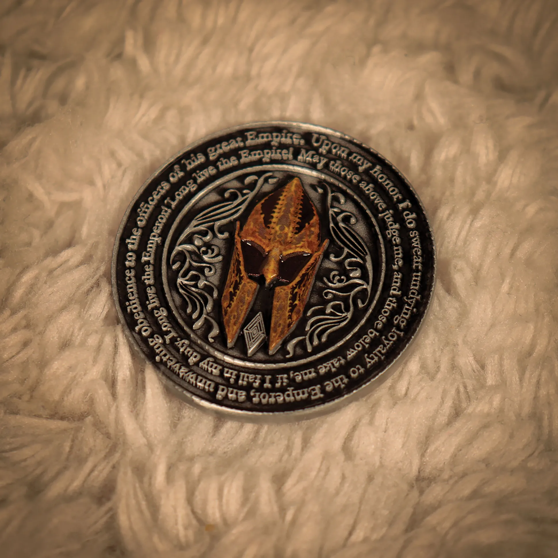 De Keizerlijke Stad altijd bij je? Met deze officieel gelicentieerde verzamelmunt van The Elder Scrolls IV: Oblivion haal je een stukje Cyrodiil zo je inventory in. Dubbelzijdig geslagen: het Keizerlijk Paleis aan de ene kant en een keizerlijke helm aan de andere—details waar elke smid jaloers op is.