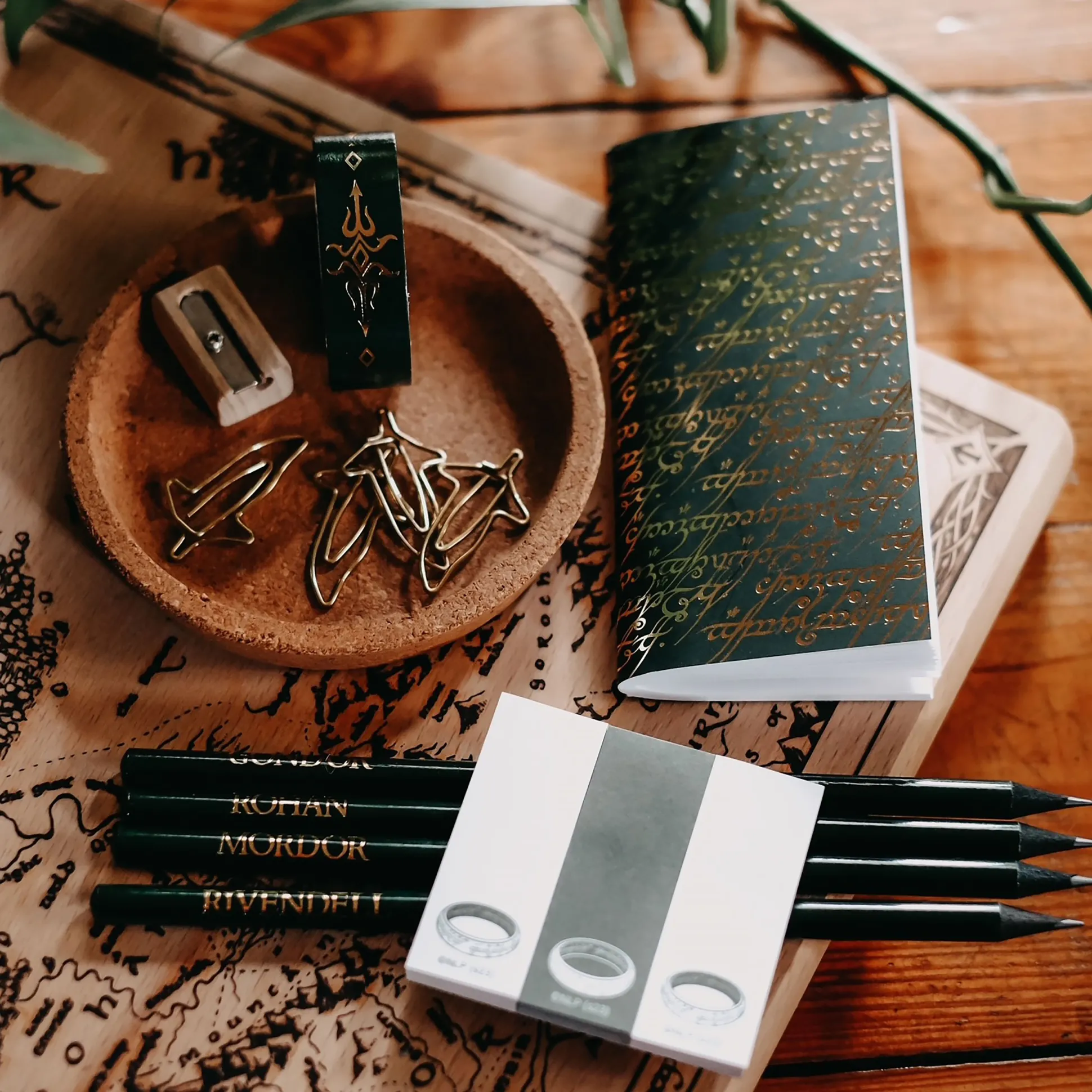 - paperclips in de vorm van bladbroches, plakmarkeerders en notitieboekje in De Ene Ring ontwerp