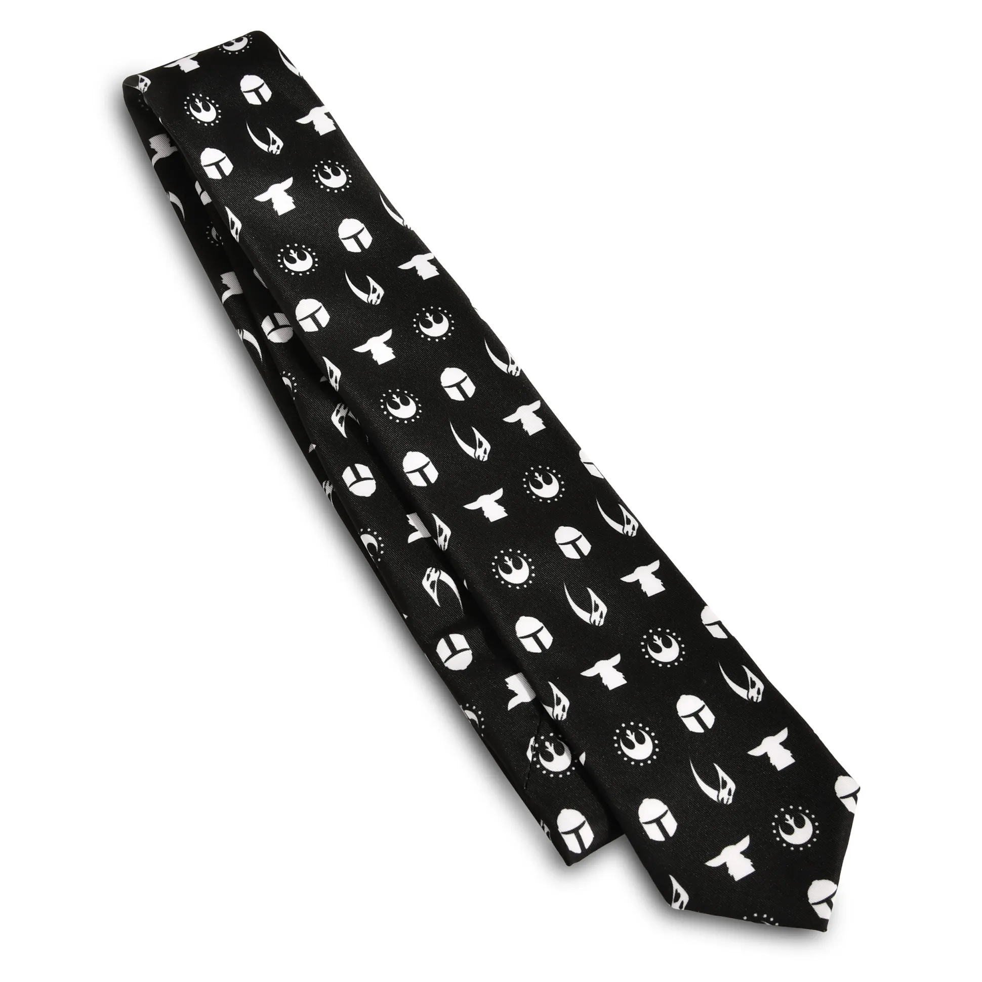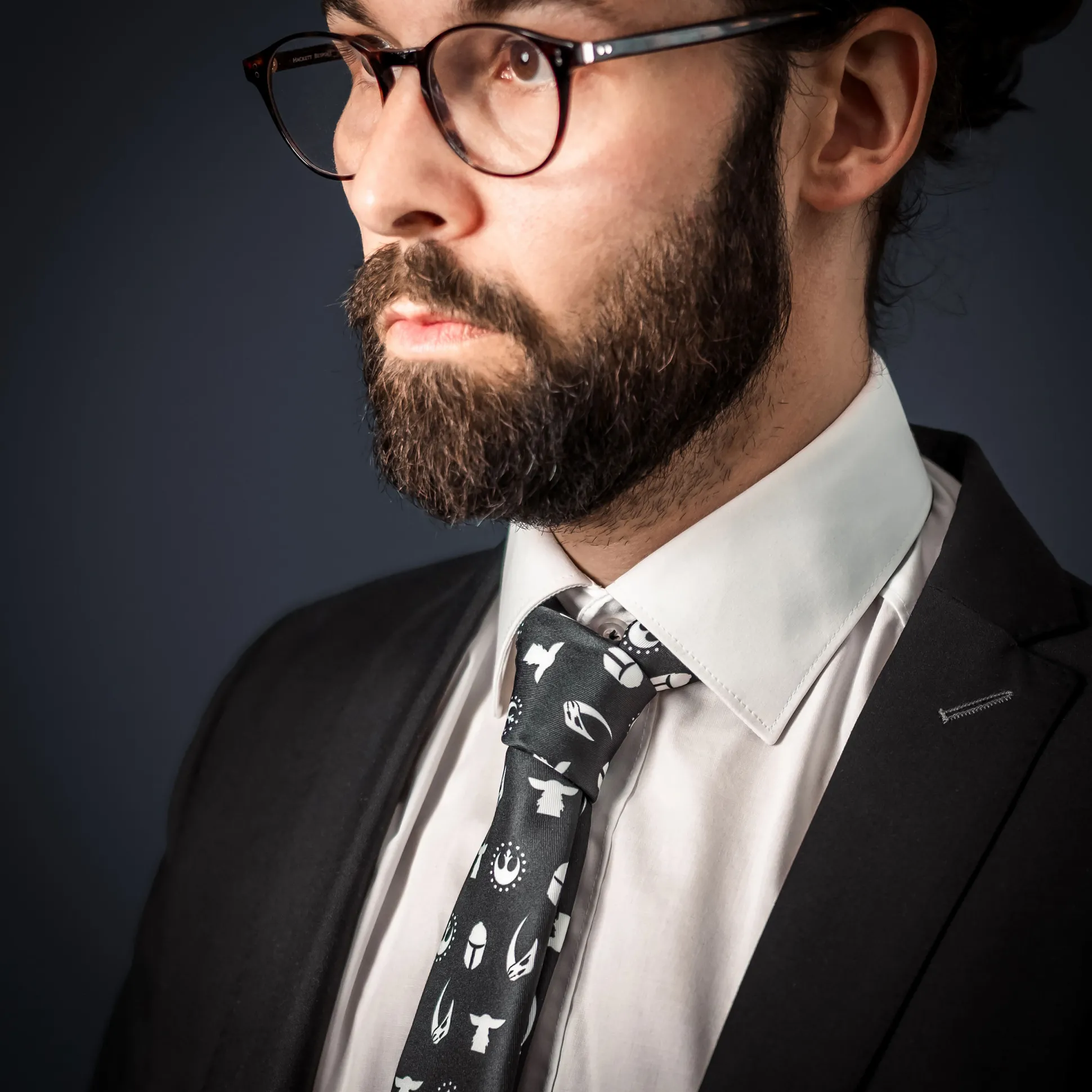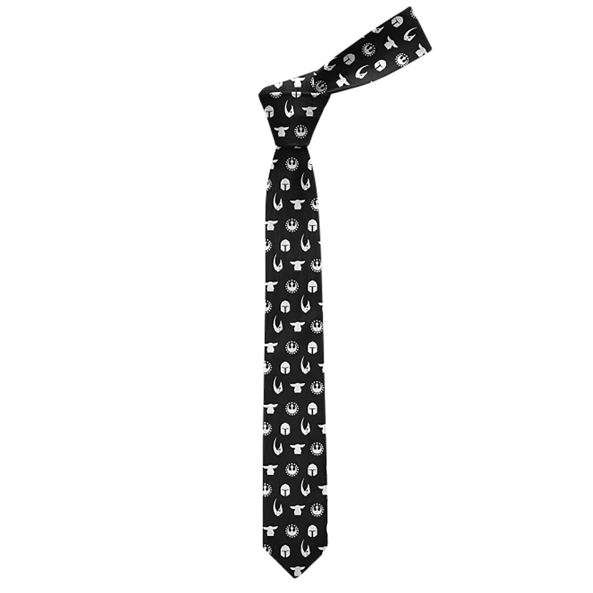Dresscode: bounty hunter chic. Deze officieel gelicentieerde Star Wars-stropdas stopt The Mandalorian-symbolen in een strak zwart-wit design: Grogu, de Mandalorian-helm, de Nieuwe Republiek en de Clan Mudhorn zijn allemaal van de partij. Moderne look, zacht gevoel — knoopt als een droom en draagt de hele dag comfortabel. Met 152 cm lengte klaar voor kantoor, date night of de volgende con. Subtiel genoeg voor de boardroom, nerdy genoeg voor de cantina. Dit is de weg.