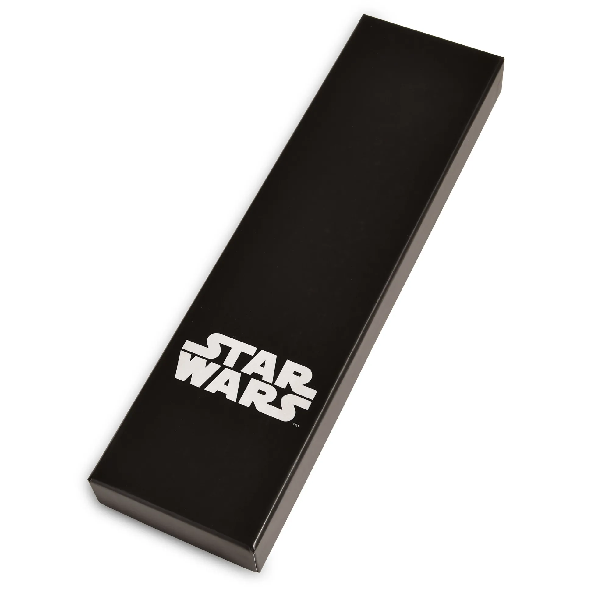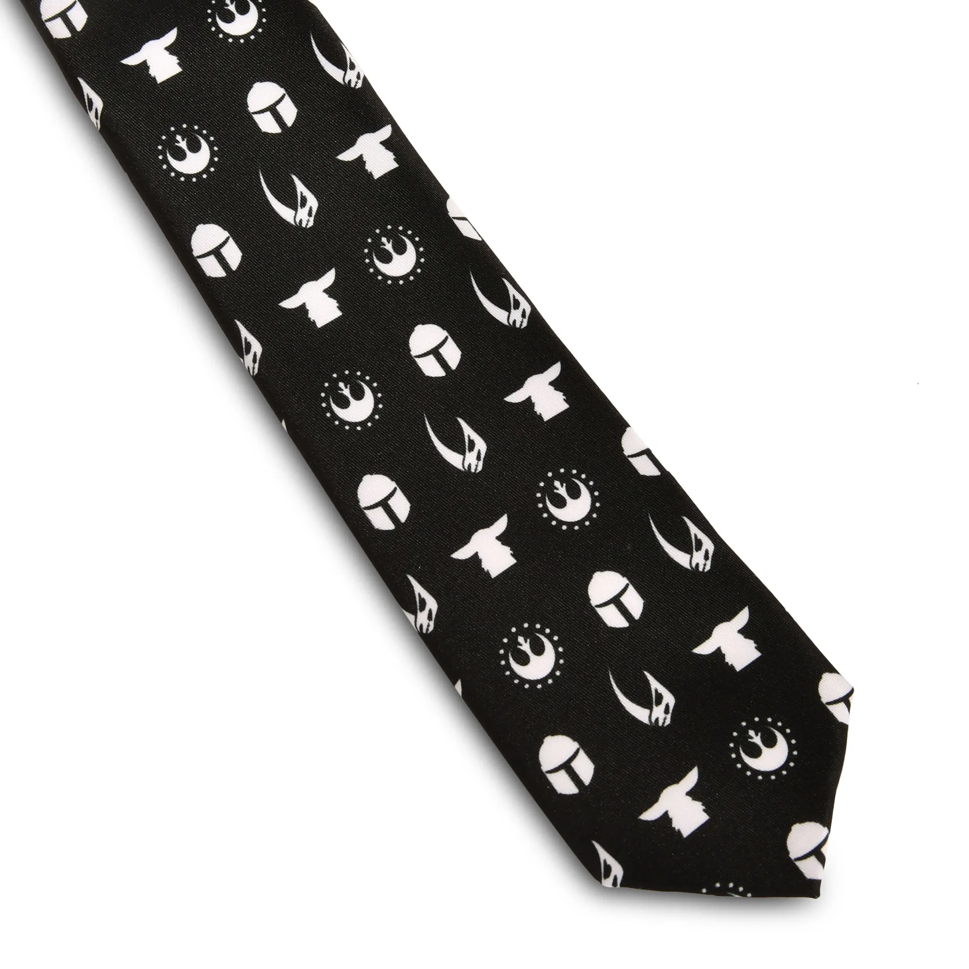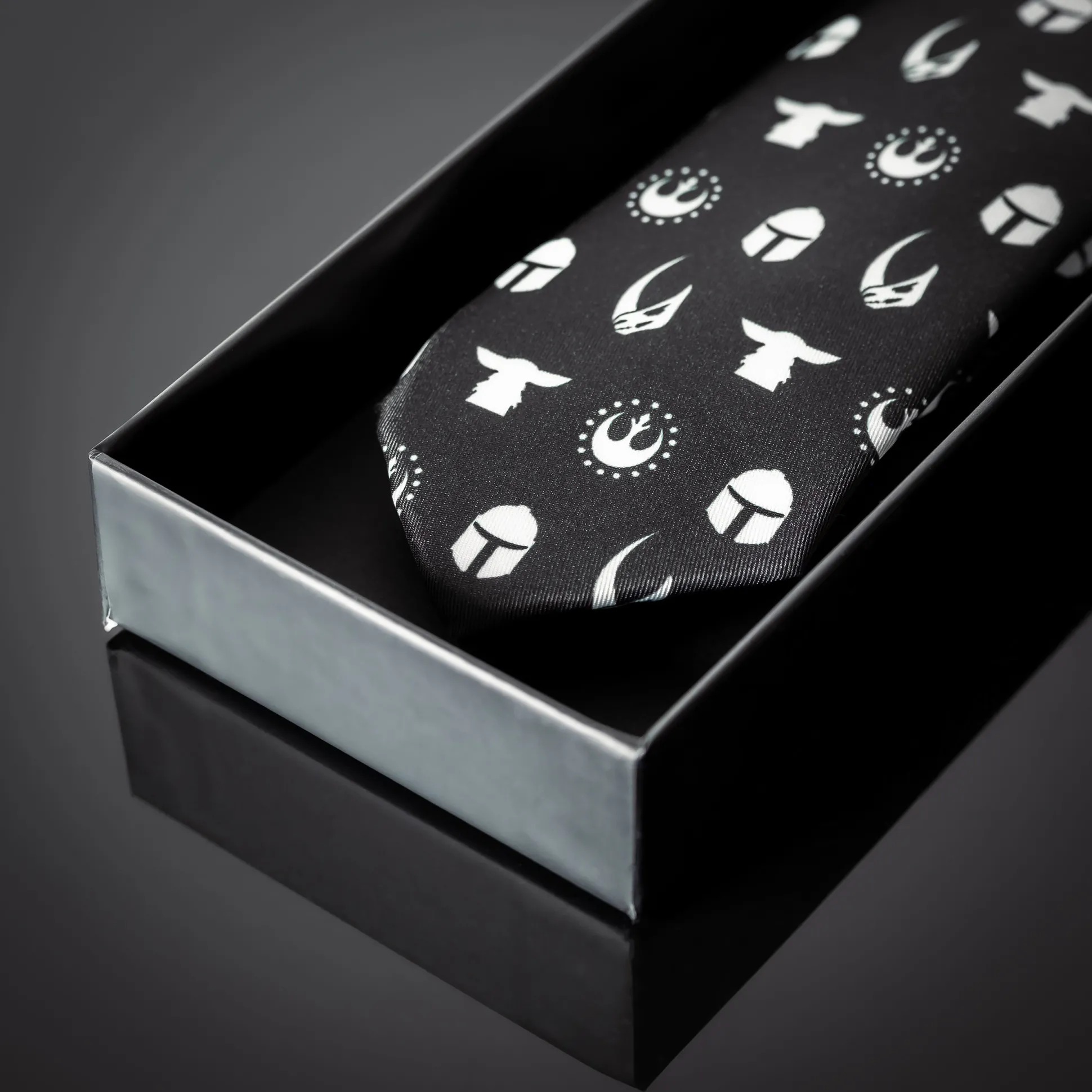 Dresscode: bounty hunter chic. Deze officieel gelicentieerde Star Wars-stropdas stopt The Mandalorian-symbolen in een strak zwart-wit design: Grogu, de Mandalorian-helm, de Nieuwe Republiek en de Clan Mudhorn zijn allemaal van de partij. Moderne look, zacht gevoel — knoopt als een droom en draagt de hele dag comfortabel. Met 152 cm lengte klaar voor kantoor, date night of de volgende con. Subtiel genoeg voor de boardroom, nerdy genoeg voor de cantina. Dit is de weg.