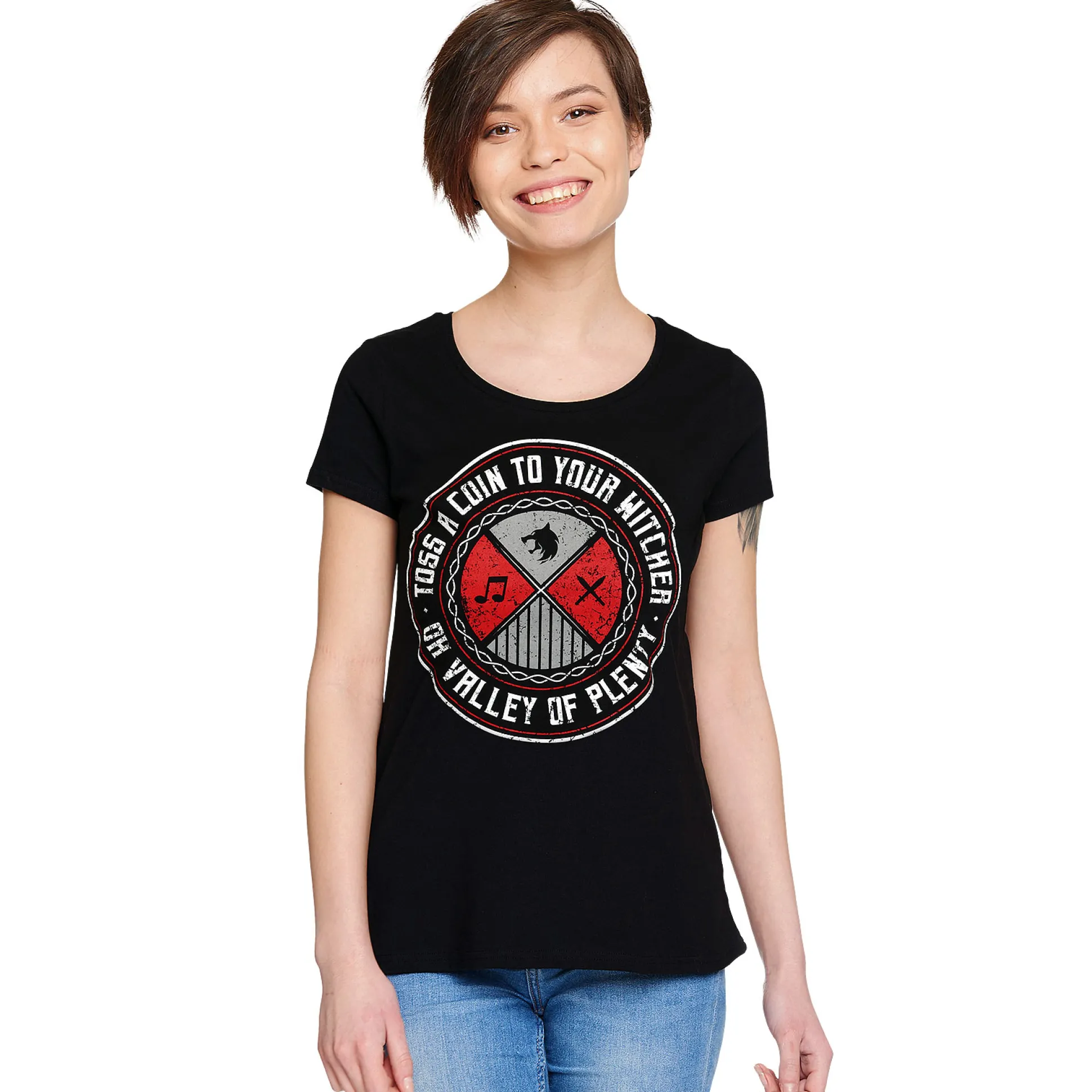 Waarschuwing: oorwurm! Met dit zwarte The Witcher dames T-shirt draag je Jaskiers (aka Dandelion) cultrefrain op je borst: ‘Toss a Coin to Your Witcher, Oh Valley of Plenty’. De grote frontprint viert de hit uit de serie en laat iedereen weten aan welke bard je trouw zweert. Regular fit en een klassieke ronde hals houden het comfortabel – perfect voor bingewatchen, gamen of je volgende con. Kleur: zwart, stijl: casual, boodschap: legendarisch. Gooi een muntje in je garderobe en klik op toevoegen aan winkelwagen.