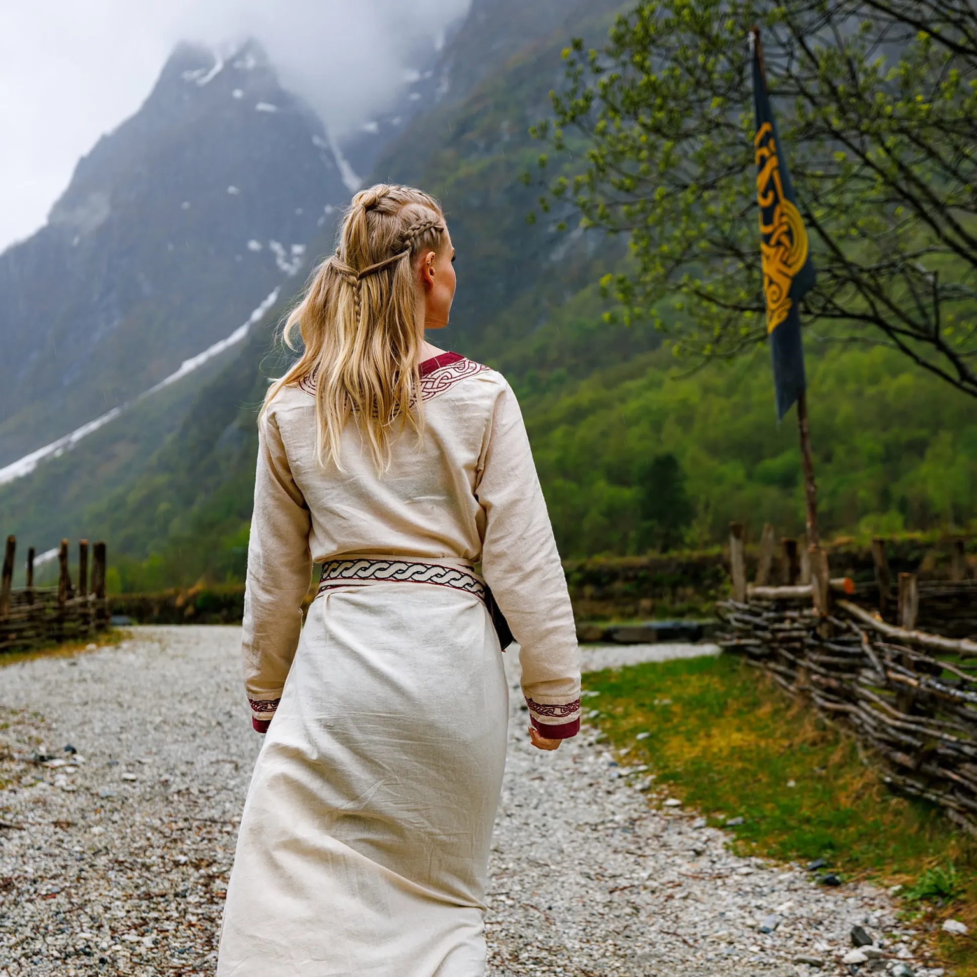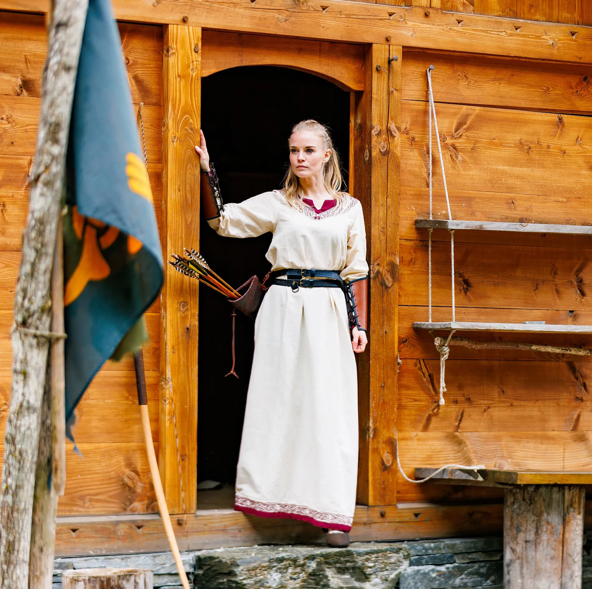 De Viking jurk Lagertha in beige-rood is perfect voor alle Viking evenementen, middeleeuwse festivals of zelfs fantasy LARP feesten. Je zult gegarandeerd een sterk en indrukwekkend figuur slaan met deze jurk die iedereen in het oog zal springen.