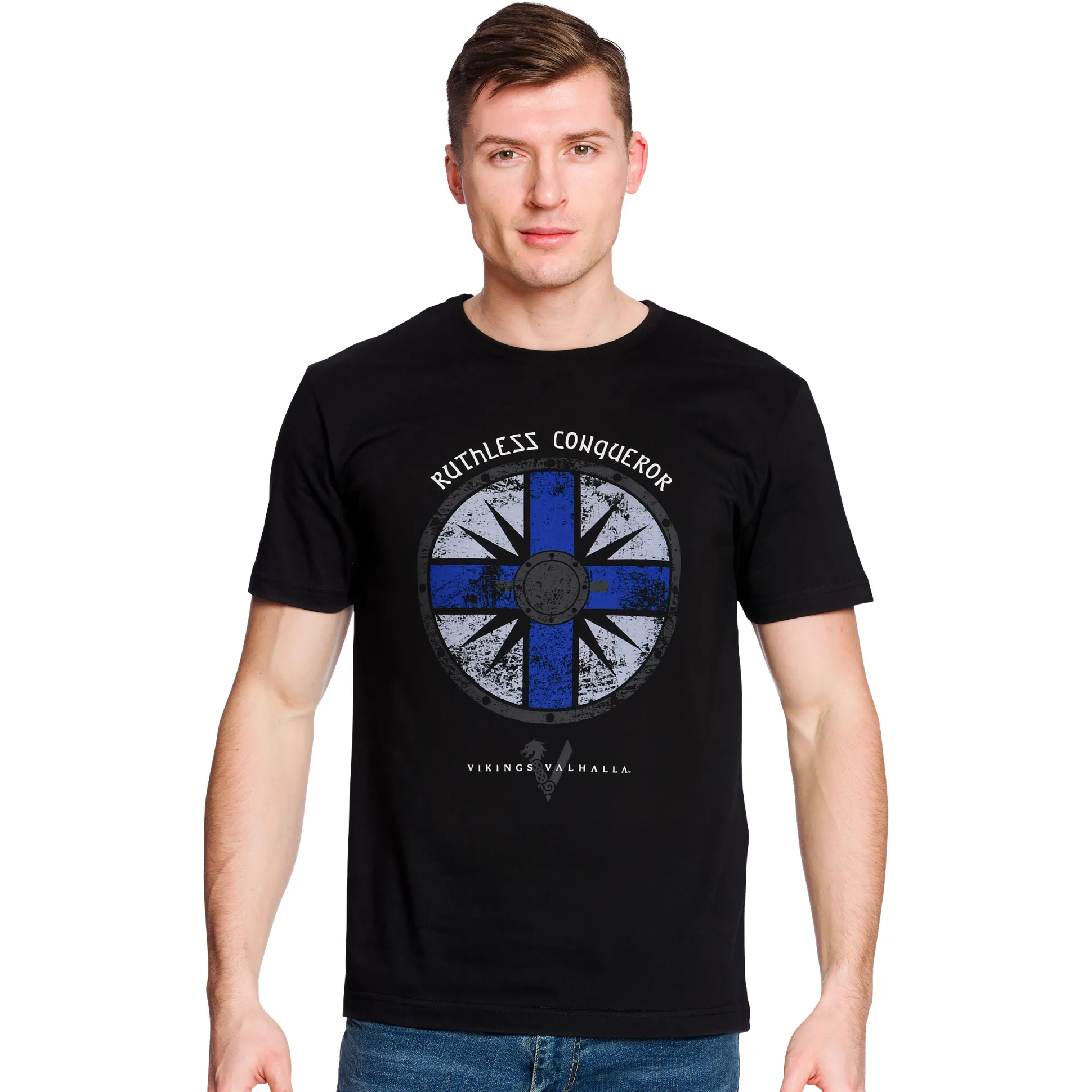 Zin om te veroveren — desnoods alleen de bank? Met het Vikings: Valhalla ‘Ruthless Conqueror’ T-shirt laat je zien wie er aan boord de baas is. Het grootformaat design met logo en tekst knalt op de voorkant; de rest blijft klassiek: rechte pasvorm, ronde hals, diepzwart. Officieel gelicenseerd — zelfs Odin knikt goedkeurend.