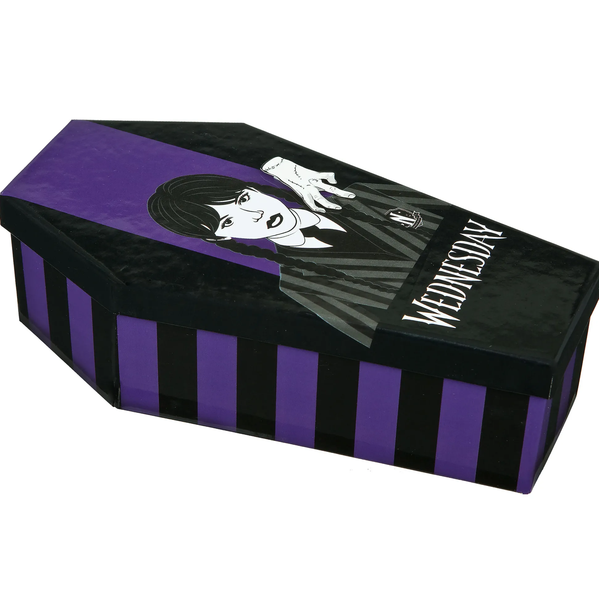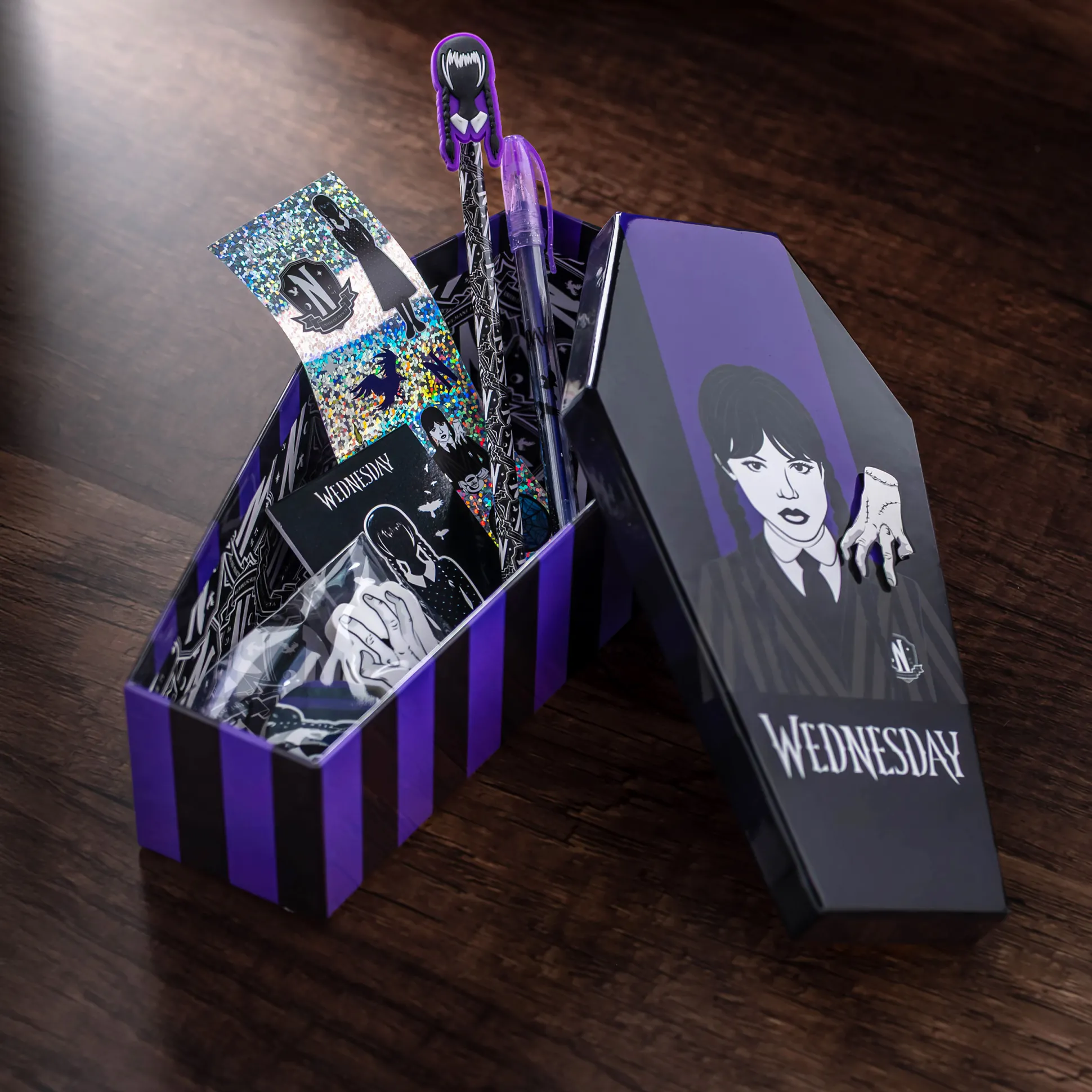 Notities zo scherp als Wednesdays blik? Met deze officieel gelicenseerde Wednesday schrijfset is dat zo gefikst. 8‑delig vol Nevermore‑vibes, verpakt in een doodskistvormige geschenkdoos.