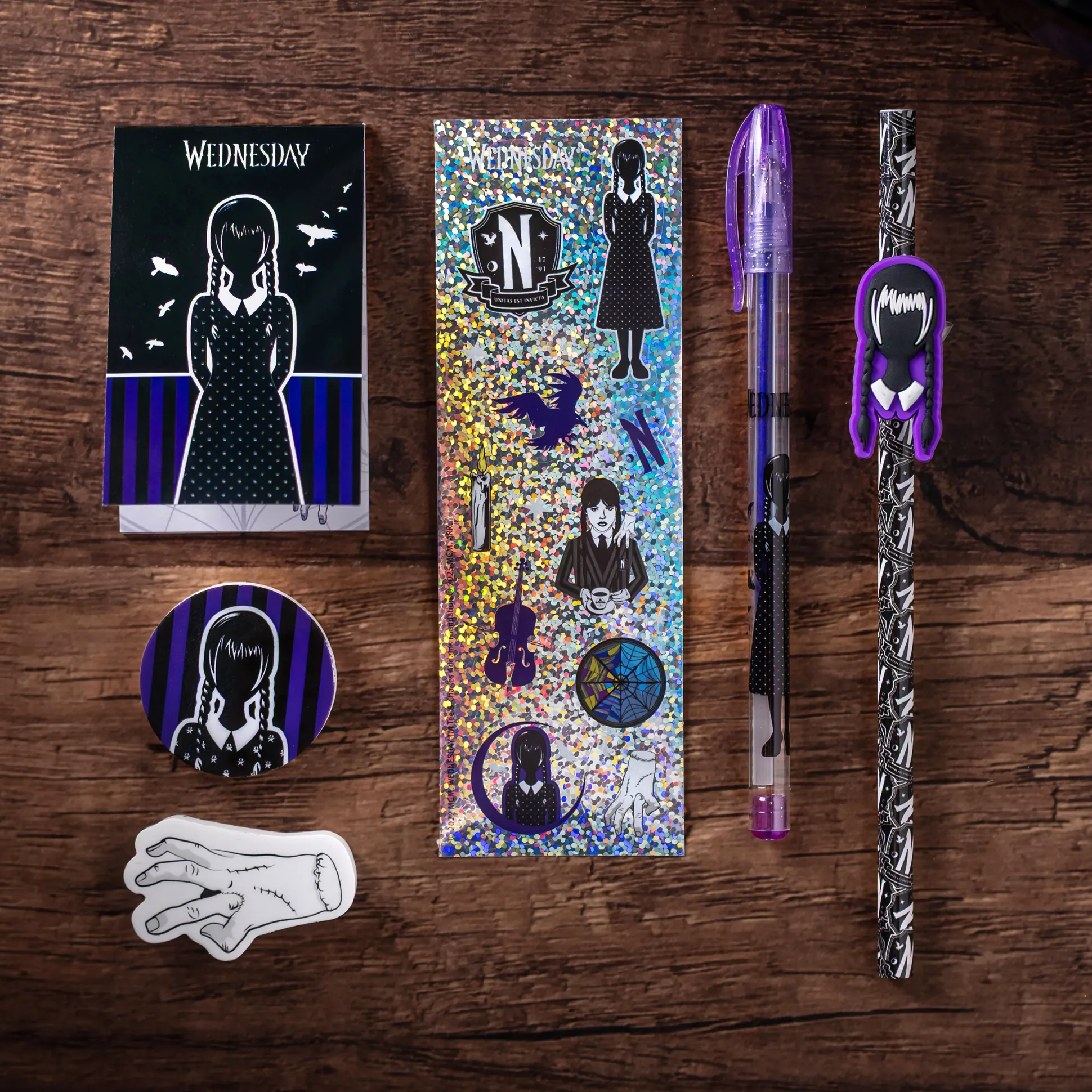 Inhoud: 1 gelpen (paarse inkt), 1 potlood met figuurtopper, 1 notitieblok, 2 gummen (Wednesday Addams en Thing) en 1 stickerblad met heerlijk duistere designs.