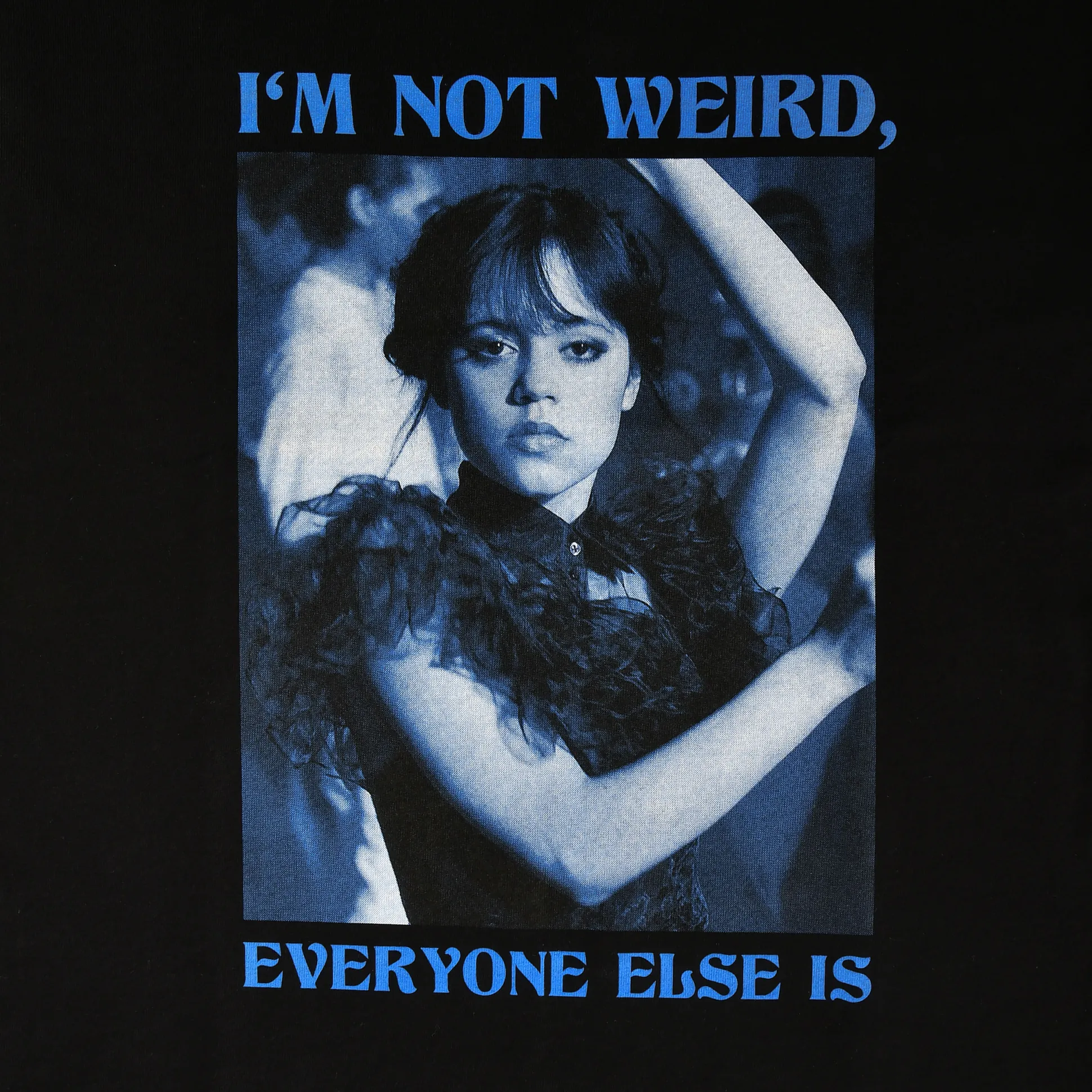 Zwart, sarcastisch en klaar voor je moves: met dit officieel gelicentieerde Wednesday oversized T‑shirt haal je de iconische dance‑vibe uit de serie zo je kledingkast in. De frontprint toont een Wednesday‑poster met de tekst “I’m Not Weird Everyone Else Is” — subtiele boodschap, maximaal effect.