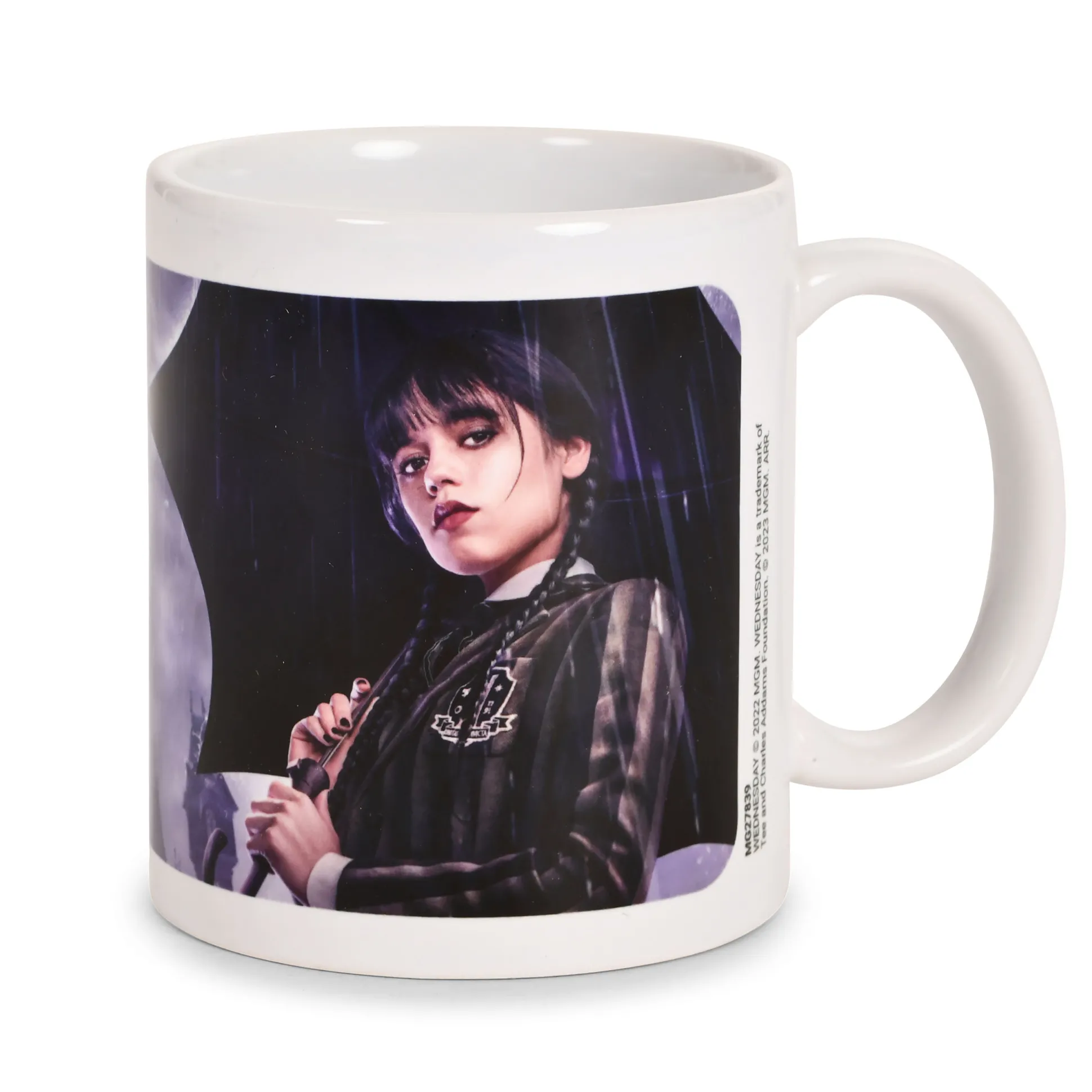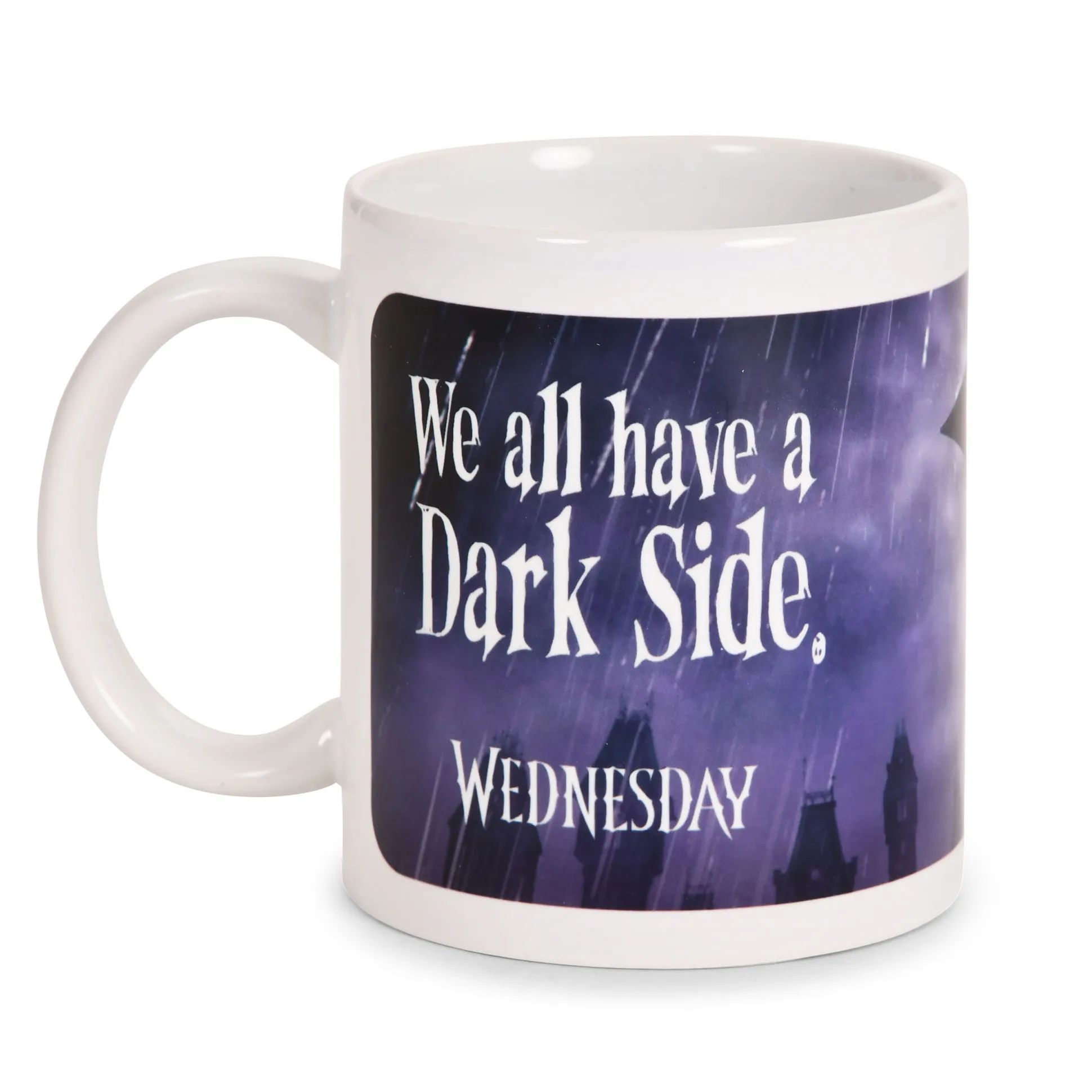 Weersverwachting: donkere wolken met een grote kans op cafeïne. Deze officieel gelicenseerde Wednesday Dark Side mok brengt stormachtige vibes naar je bureau met het “Wednesday Downpour Teaser”-design en het citaat “We all have a Dark Side. Wednesday”. Inhoud 320 ml, vaatwasser- en magnetronbestendig — klaar voor koffie, thee of mysterieuze brouwsels. Perfect voor The Addams Family-fans die hun ochtenden zwart en hun humor nog zwarter willen.