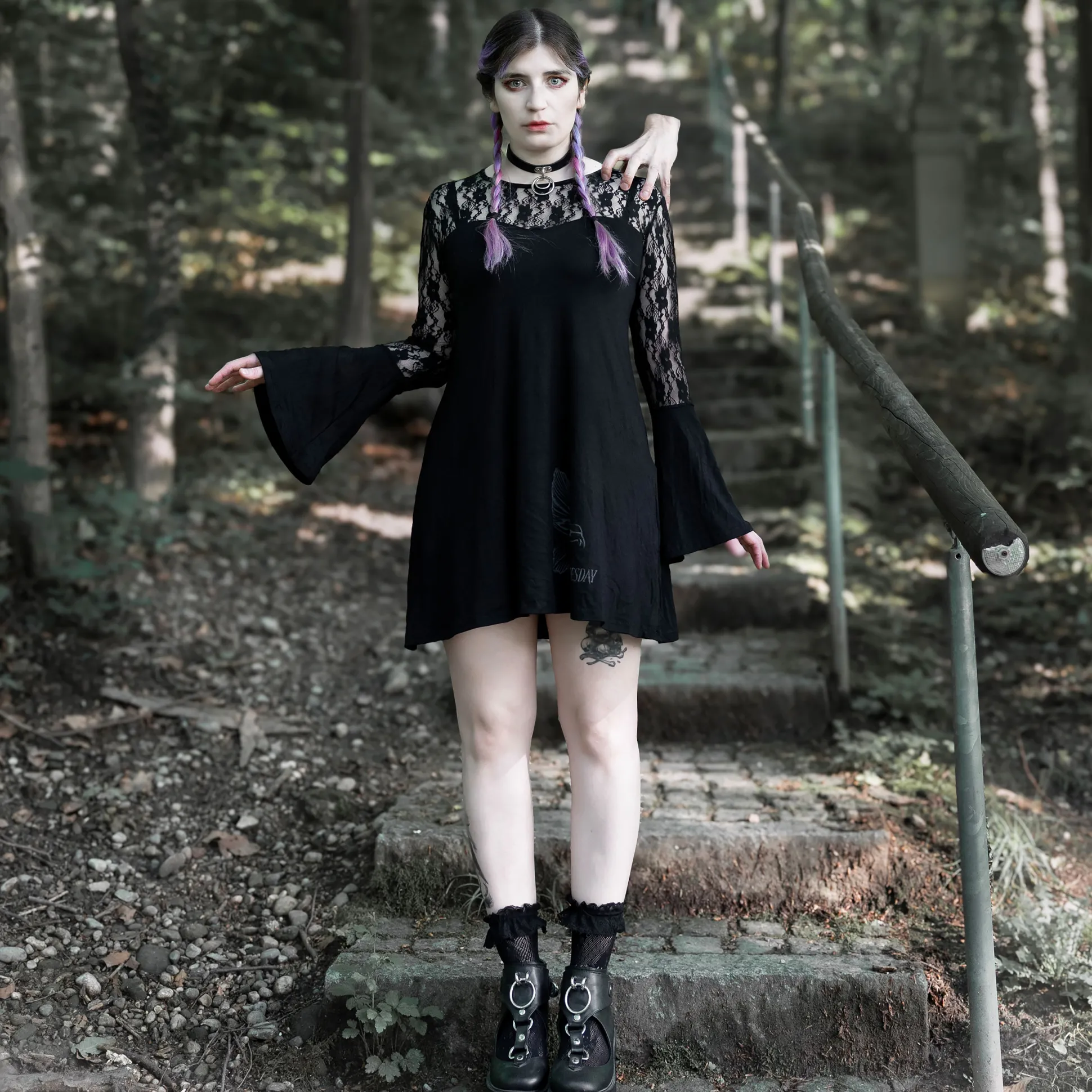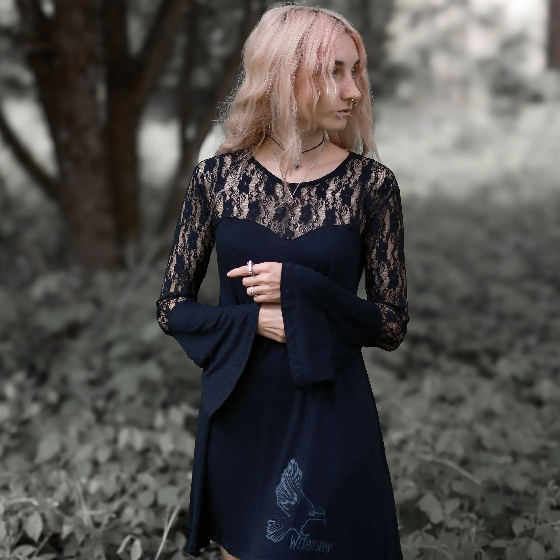 Begroet de duisternis als je oude vriend met deze officieel gelicentieerde woensdag mini jurk! Met zijn mysterieuze kraaien rugprint en de cryptische ‘Darkness …My Old Friend’ belettering, is deze jurk de perfecte keuze voor iedereen die hun donkere kant stijlvol wil uitdrukken. De lange trompetmouwen, de rug en de mouwen zijn versierd met elegante kant, wat de jurk een vleugje mystiek en elegantie geeft. Dankzij de losse snit en de kleur zwart, kan de jurk gecombineerd worden met zowel casual als chique accessoires. En het beste? Met het kleine logo met kraai op de voorkant, laat je iedereen zien dat je een echte woensdag fan bent! Dus, waar wacht je nog op? Duik in de wereld van woensdag en maak de duisternis je oude vriend!