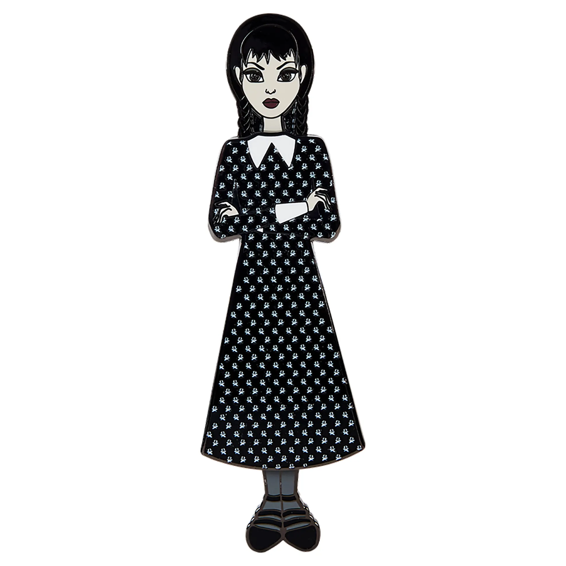 Glimlachen? Niet haar ding. Iconische stijl? Altijd. Neem Wednesday Addams mee zonder een spier te vertrekken: deze officieel gelicentieerde pin heeft een pop-look en wordt geleverd met 3 magnetische outfits die je in seconden kunt wisselen. Een stevige vlindersluiting houdt haar precies waar je haar vastprikt—op je jas, rugzak of tas. Afmetingen: 4,5 x 11,2 x 0,3 cm. Om te verzamelen, om te dragen, zalig onverschillig.