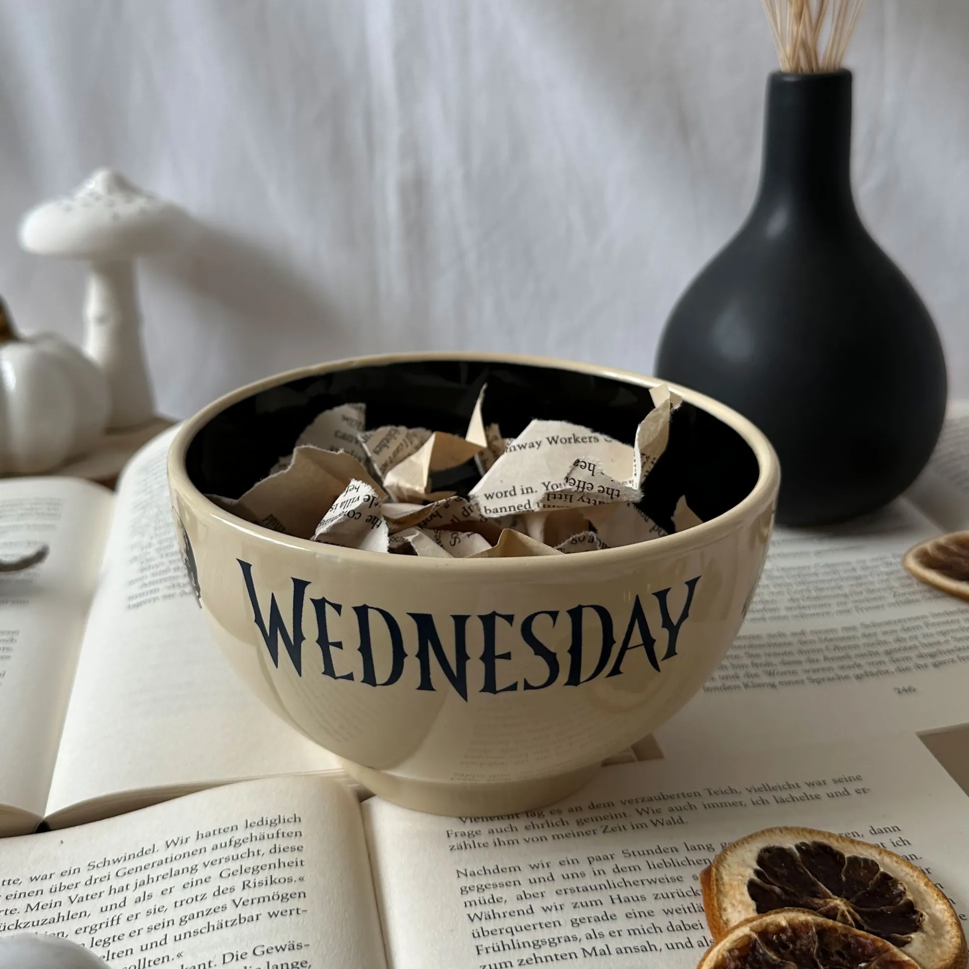 Maak je ontbijt zo heerlijk duister als de humor van Wednesday. Deze officieel gelicentieerde mueslikom is bedrukt met het logo en iconen — schedel, maan en natuurlijk Thing — en serveert bij elke hap een vleugje Nevermore‑vibes.