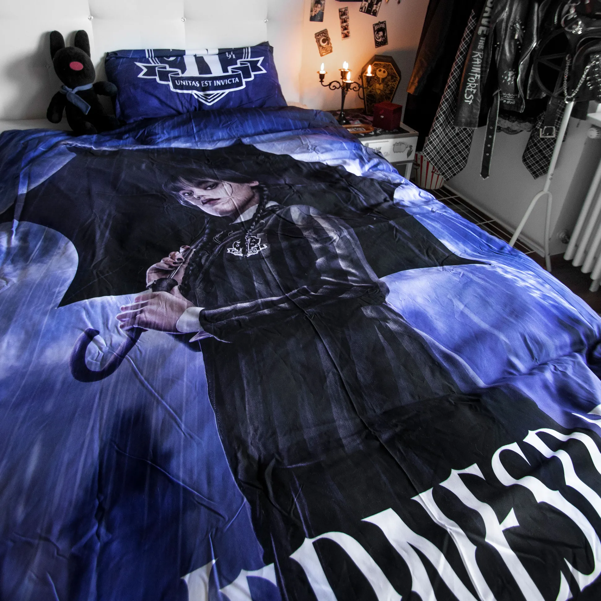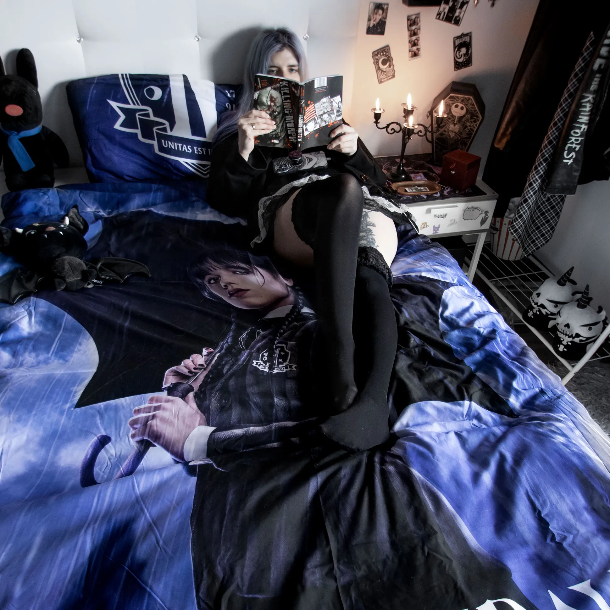 Slaap als een buitenbeentje: met de Wednesday – Nevermore Academy dekbedovertrekset verandert je bed in een slaapzaal — zonder raven op de vensterbank. Wednesday in haar Nevermore Academy-uniform waakt over je dromen (of nachtmerries) en brengt precies de juiste dark vibes naar je slaapkamer.