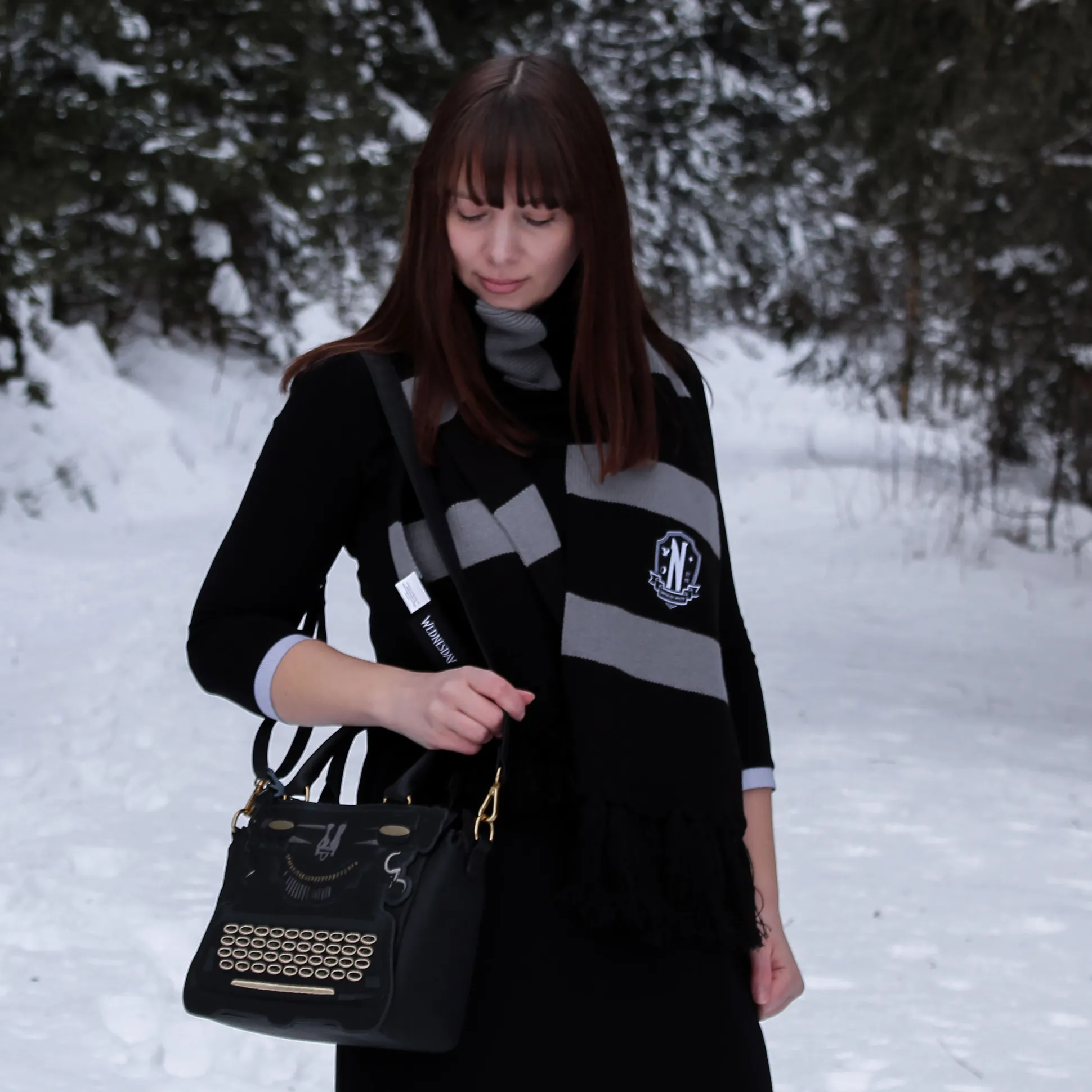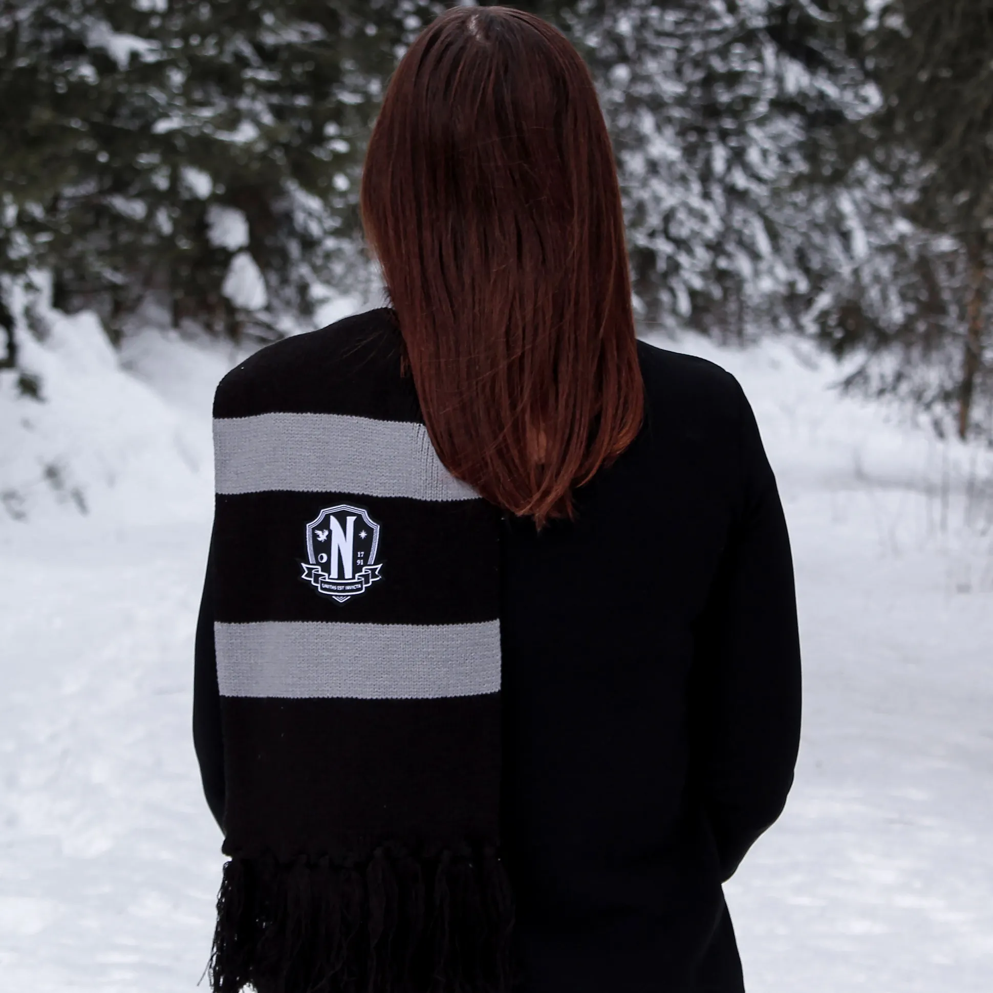 Wil je toetreden tot de elite der buitenbeentjes? Deze Wednesday sjaal in Nevermore Academy-design regelt het – zonder toelatingstest. Zwart en grijs, 190 cm lang (met franjes) en 24 cm breed, met een opgenaaid embleem met het schoolwapen – net zo trots als jij wanneer je ’m draagt. Warm, zacht en dramatisch genoeg voor je volgende mysterieuze entree.