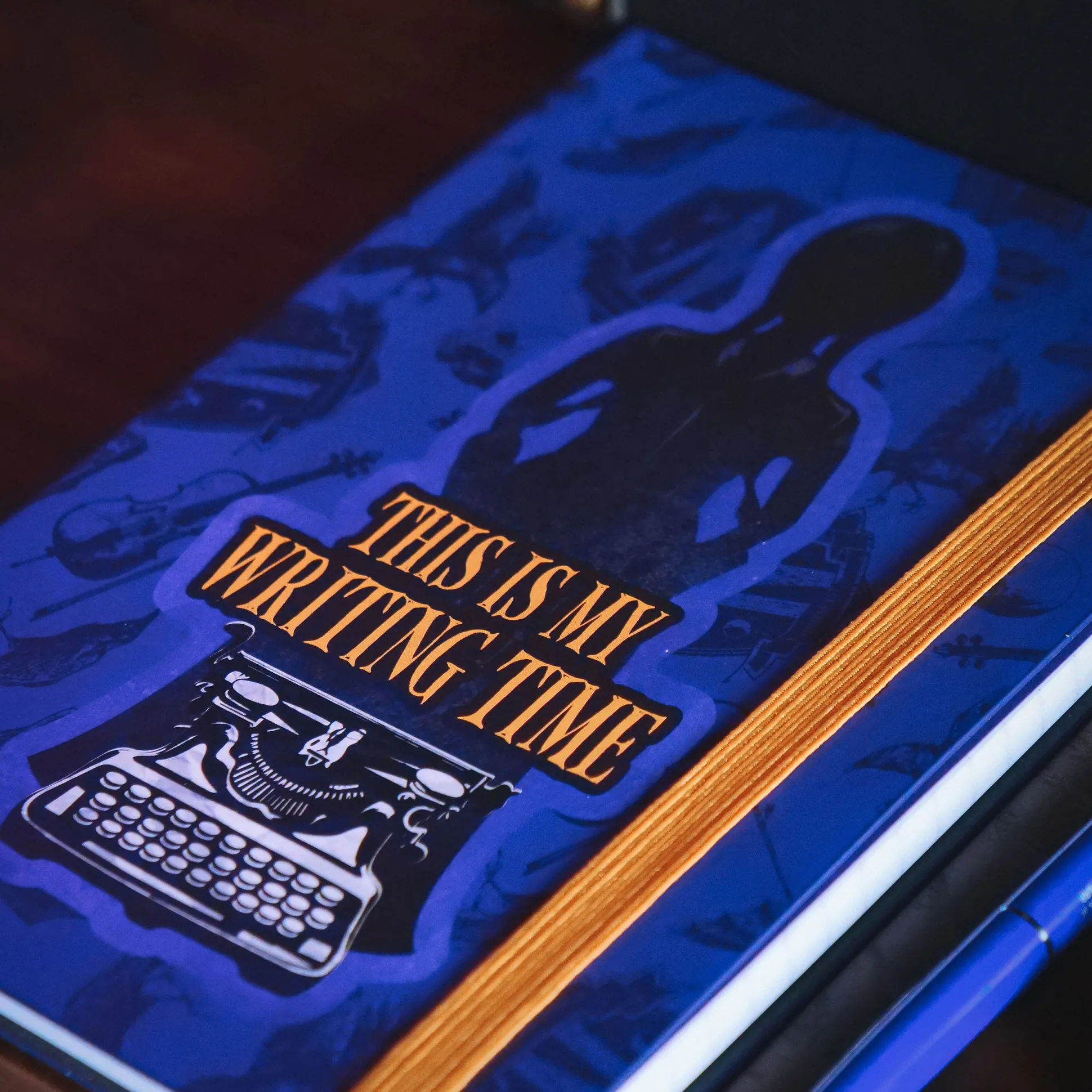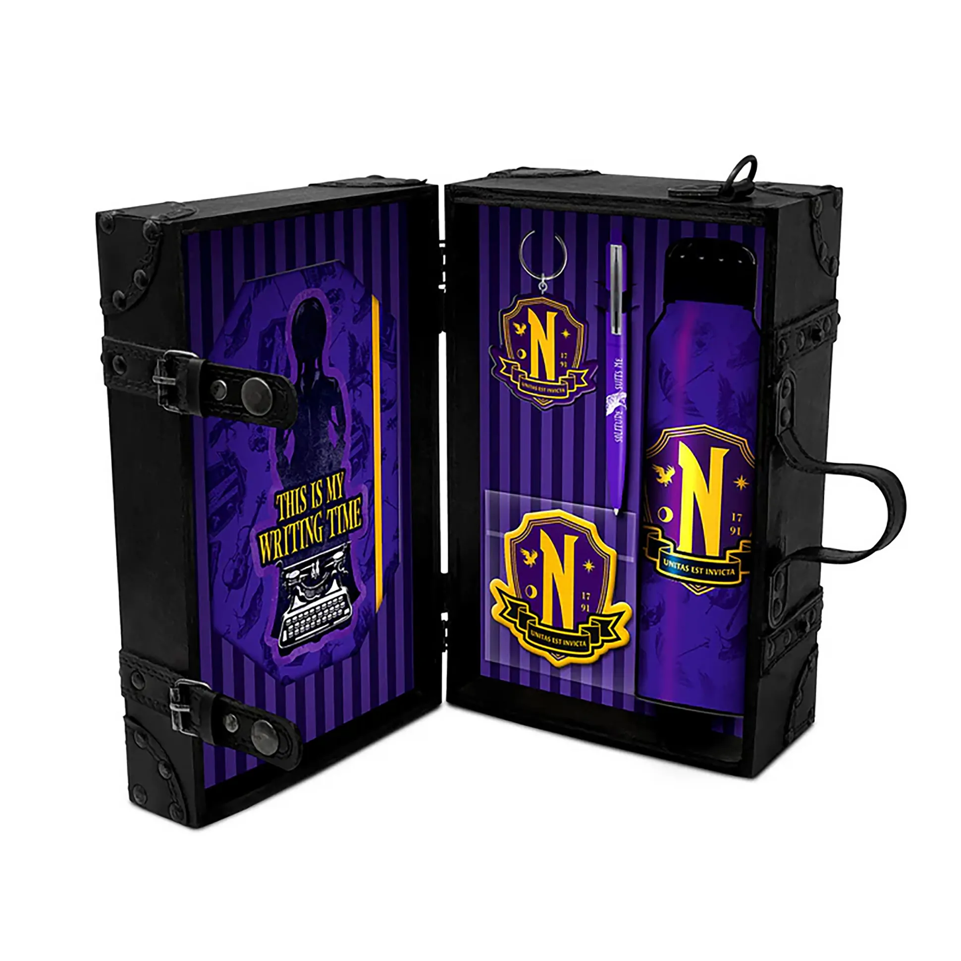 - 6-delig in Nevermore Academy design: doos in kofferstijl, drinkfles, notitieboek, balpen, sleutelhanger en opstrijkpatch