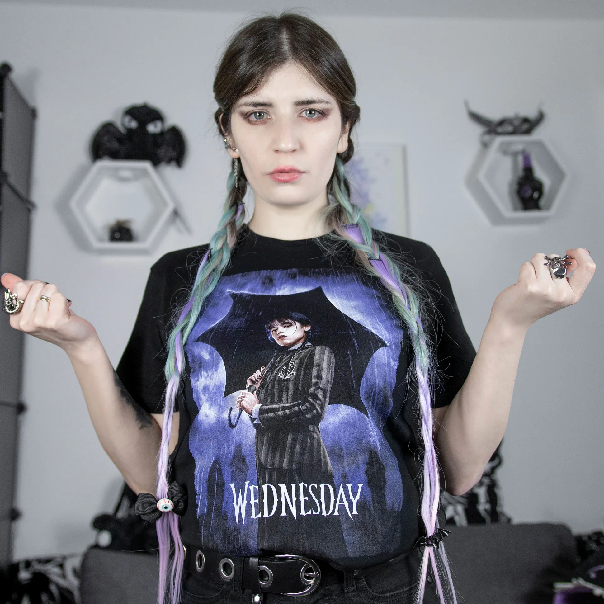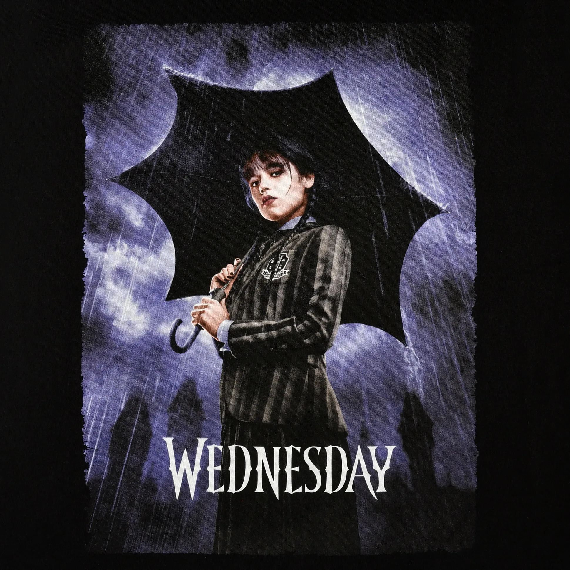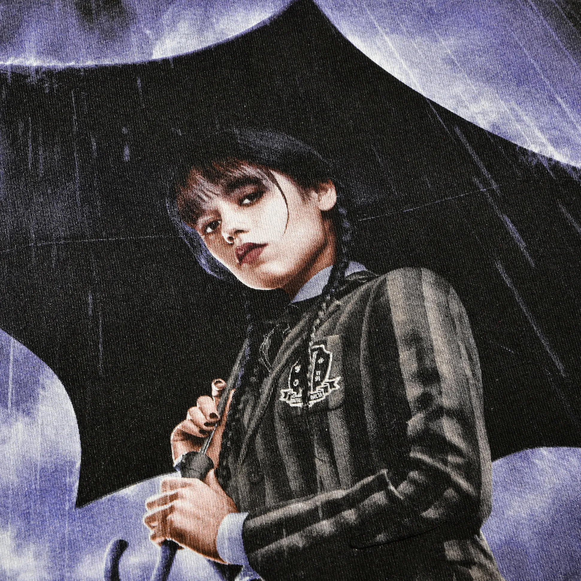Zwart als een raaf en twee keer zo iconisch: dit officieel gelicenseerde Wednesday T-shirt zet de teaserposter recht op je borst. Voorop staat het dramatische artwork met logo; de rechte pasvorm en ronde hals houden het comfortabel voor al je stoïcijnse vibes. Pikzwart, volle attitude — combineer met je pokerface en je bent klaar. Voor binges, cons of gewoon om de gang net wat grimmiger te maken: goedgekeurd door Wednesday (soort van).