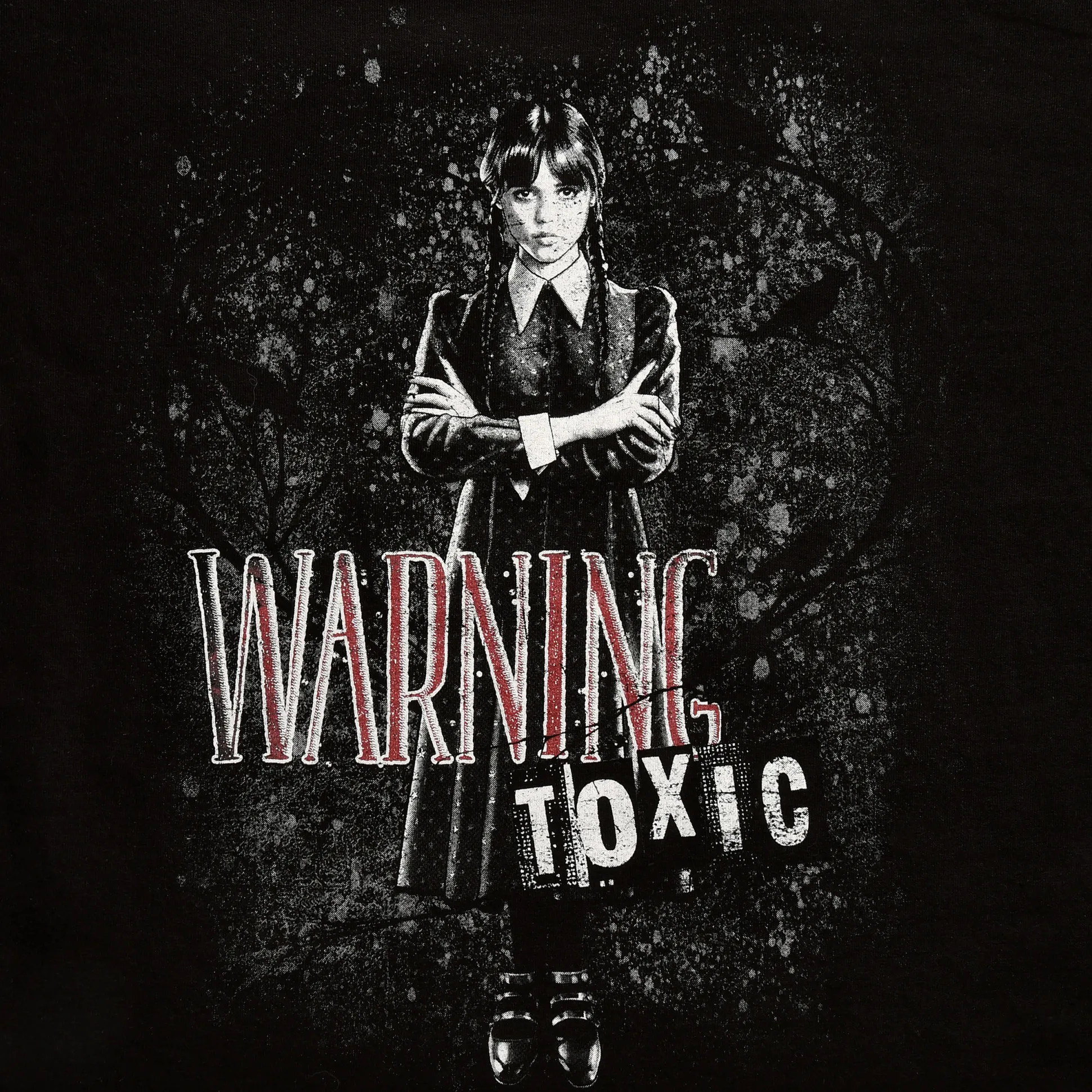 - Achterkant met Wednesday Adams en ‘Warning Toxic’ print
