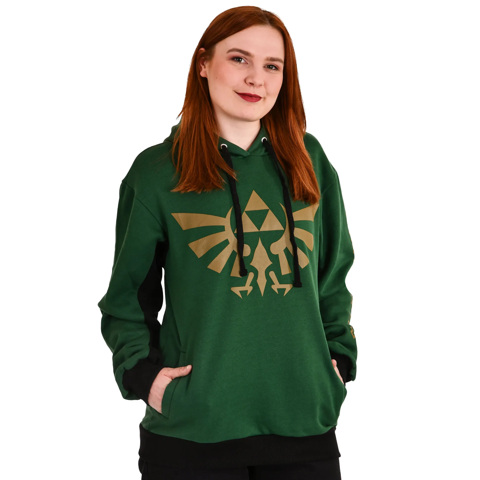 Wil je Hyrule dragen in plaats van het alleen te bezoeken? Met deze officieel gelicentieerde Nintendo-hoodie haal je Zelda-power in het dagelijks leven. Groot Hyrule-logo op de voorkant, de Poort van de Tijd op de achterkant en “The Legend of Zelda” op de mouw. Stevige boorden, een capuchon met trekkoord en twee voorzakken maken je klaar voor elke missie — warm en zacht, aan de binnenkant geruwd en in het groen.