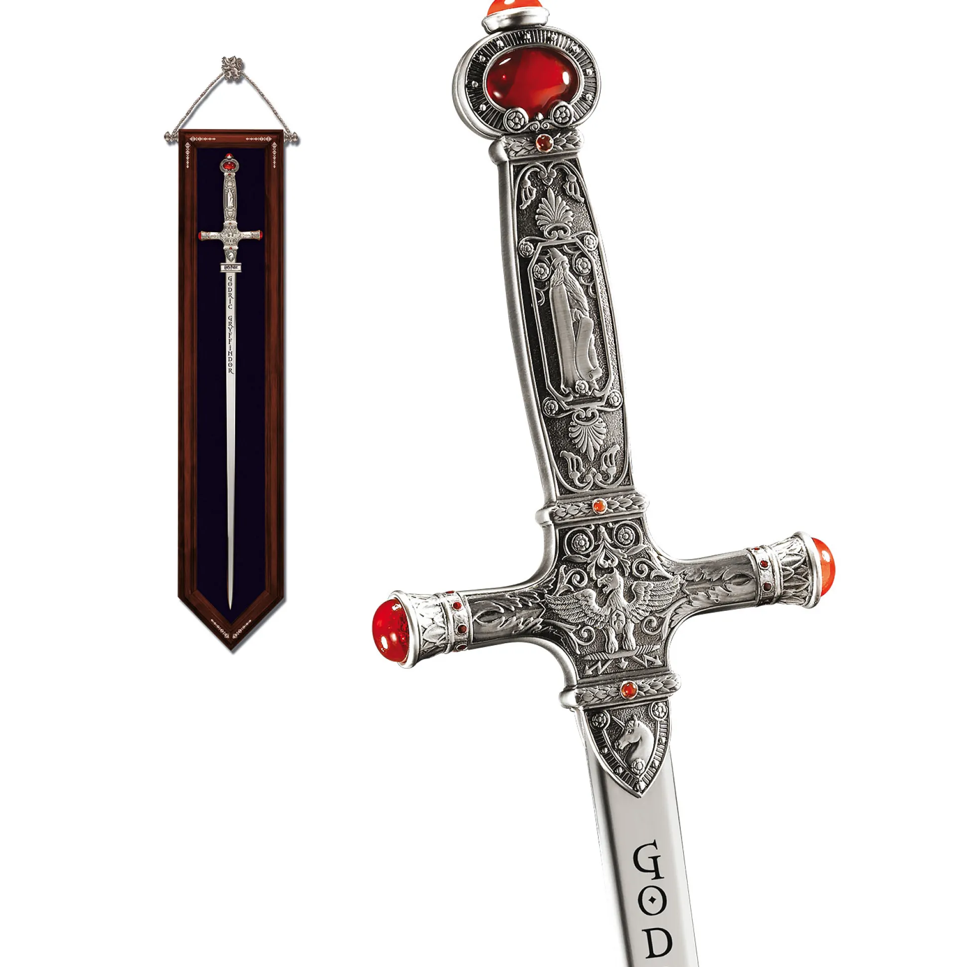 Een decoratief ontworpen houten wandmontage is inbegrepen voor een magische presentatie. Het is versierd met het wapendier van Gryffindor.