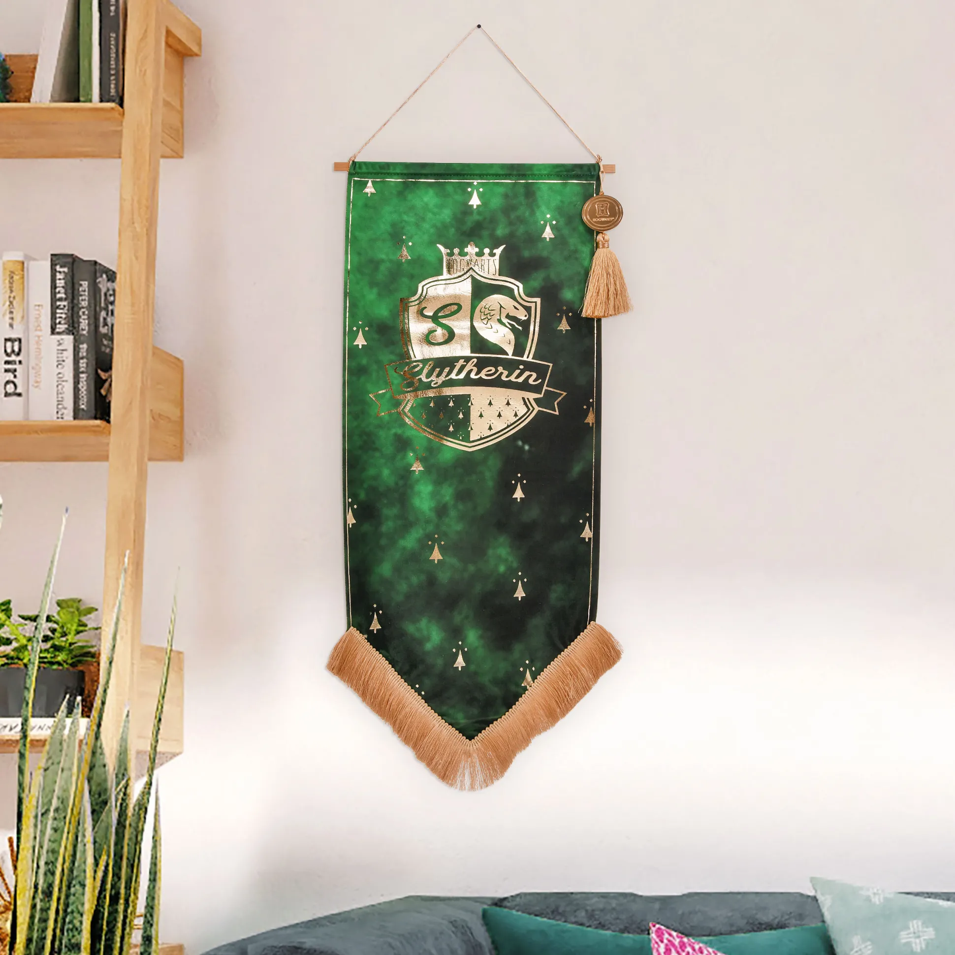 Ben je klaar om je trouw aan Zwadderich te tonen? Met onze officieel gelicentieerde Harry Potter Zwadderich-banner heb je de perfecte kans! Deze luxe, fluwelen banner met het verhoogde Zwadderich-wapen geeft je het gevoel dat je midden in de gangen van Hogwarts bent. Gemonteerd op een stevige houten paal en voorzien van een goudkleurige band om op te hangen, is deze banner een echte blikvanger. Maar dat is nog niet alles! Aan de uiteinden van de paal bevinden zich elegante kwasten en het Zweinstein-embleem, die het ontwerp afronden. Met zijn afmetingen van 24 x 58 cm past het perfect in elke kamer. Dus, waar wacht je nog op? Laat iedereen zien dat je een echte Harry Potter-fan bent en breng een stukje Zweinstein in je huis!